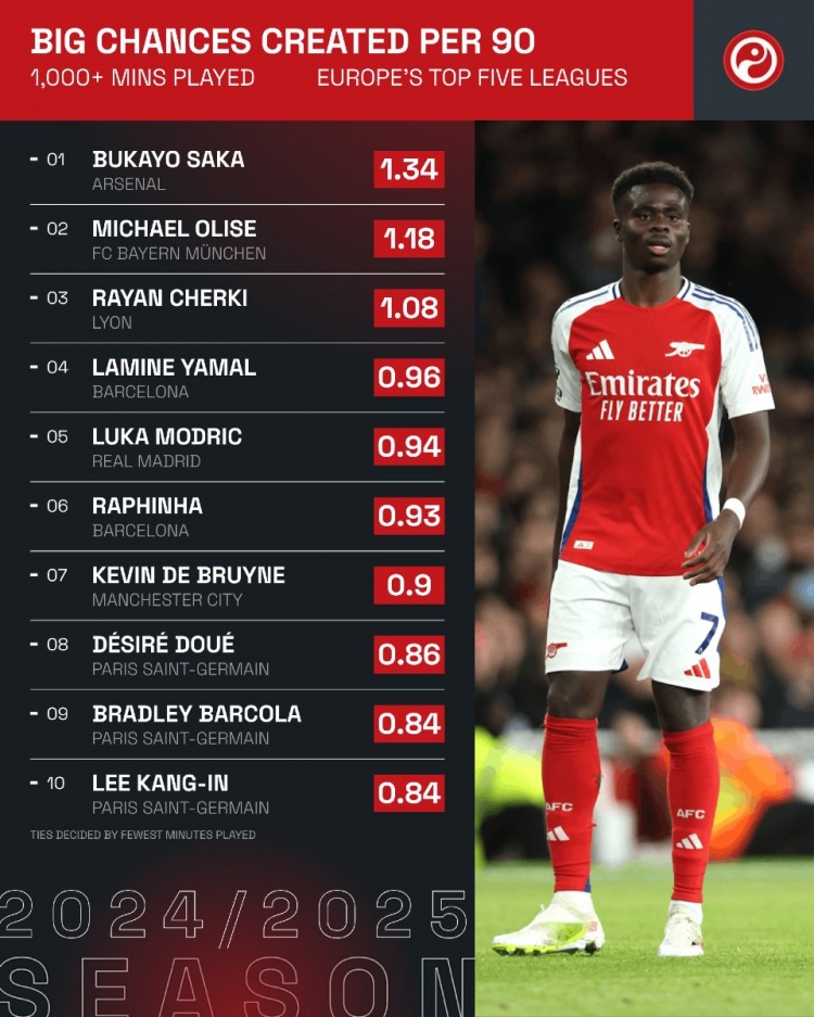 4月1日訊 Squawka統(tǒng)計了本賽季五大聯(lián)賽球員每90分鐘創(chuàng)造重大機(jī)會的次數(shù),薩卡1.34次居首,奧利塞1.18次第二。
