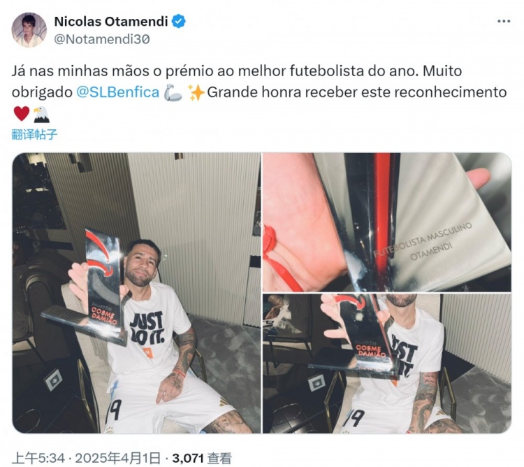 奧塔門迪今日在社交媒體上曬出手拿獎杯的照片,并配文:“年度最佳球員獎杯已經在我手中,非常感謝本菲卡,很榮幸獲得這一認可。”