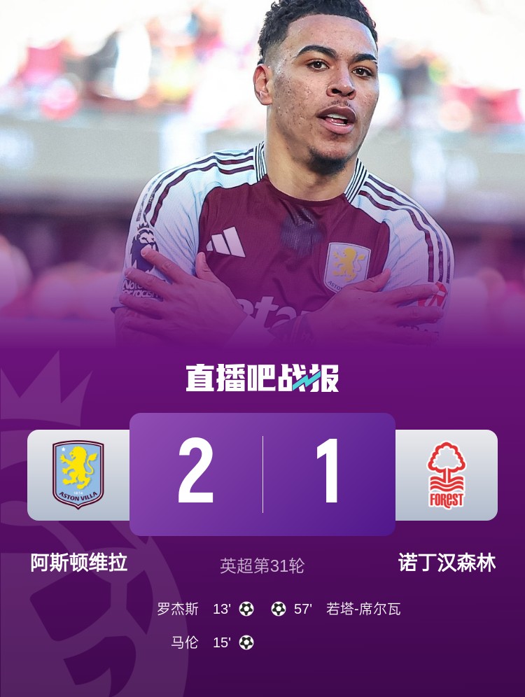 04月06日訊 英超第31輪維拉2-1擊敗森林,近期三線高歌猛進:足總杯進4強、聯賽3連勝升第6,、歐冠闖入8強。