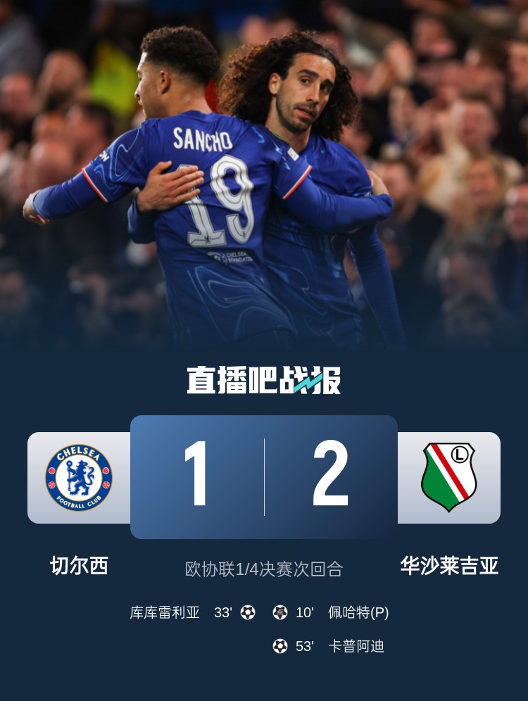 切爾西1-2不敵華沙萊吉亞,以兩回合總比分4-2淘汰對手,晉級歐協(xié)聯(lián)四強(qiáng)。