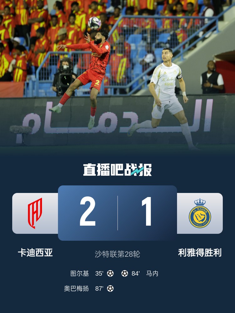 沙特聯第28輪,利雅得勝利客場1-2卡迪西亞,4輪不敗終結。上半場,圖爾基補射建功;下半場,杜蘭近距離失良機,馬內84分鐘扳平比分,奧巴梅揚87分鐘絕殺。