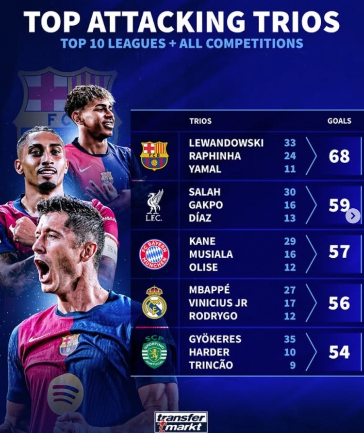 68球,巴薩(萊萬33球、拉菲尼亞24球、亞馬爾11球)