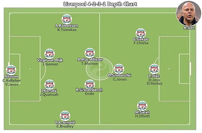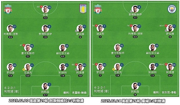 四天內兩戰強敵,利物浦的首發陣容只有1處變化,斯洛特使用了兩種截然不同的陣型和打法。