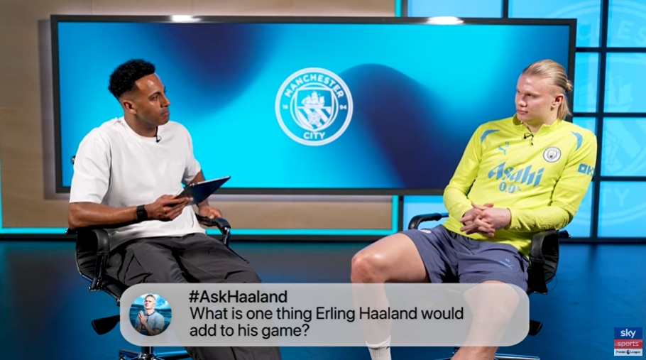 采訪者:“這是一個問哈蘭德的問題環(huán)節(jié)。我們在社交媒體上號召粉絲們與我們聯(lián)系,并向哈蘭德提問。哈蘭德,有成千上萬的人想問你問題,我們精選了一些最好的問題,你準(zhǔn)備好回答了嗎?”