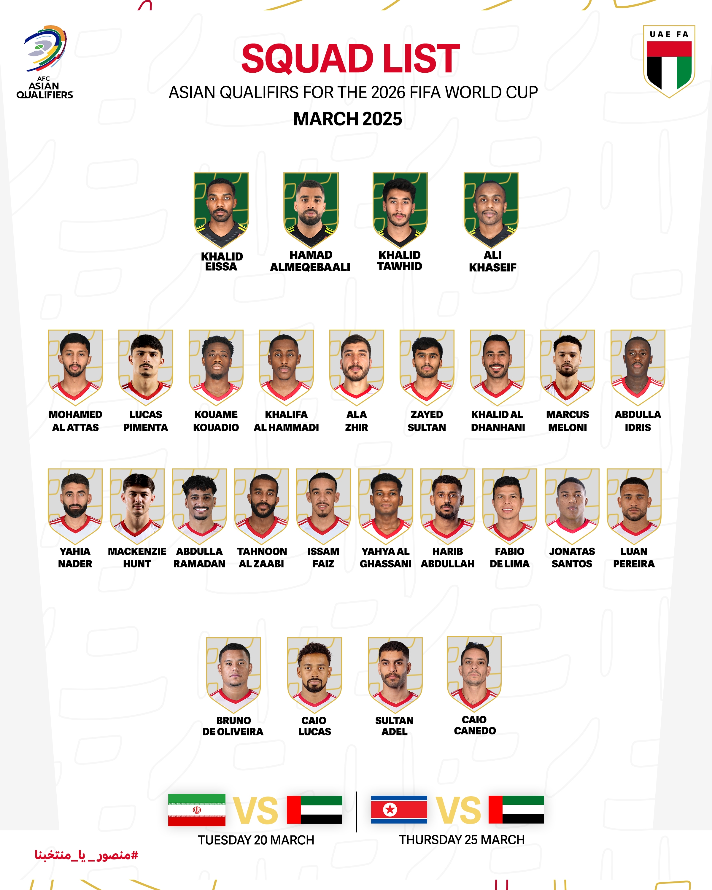 03月06日訊 阿聯酋公布了3月世預賽大名單,本月阿聯酋將于3月21日對陣伊朗,3月26日對陣朝鮮。